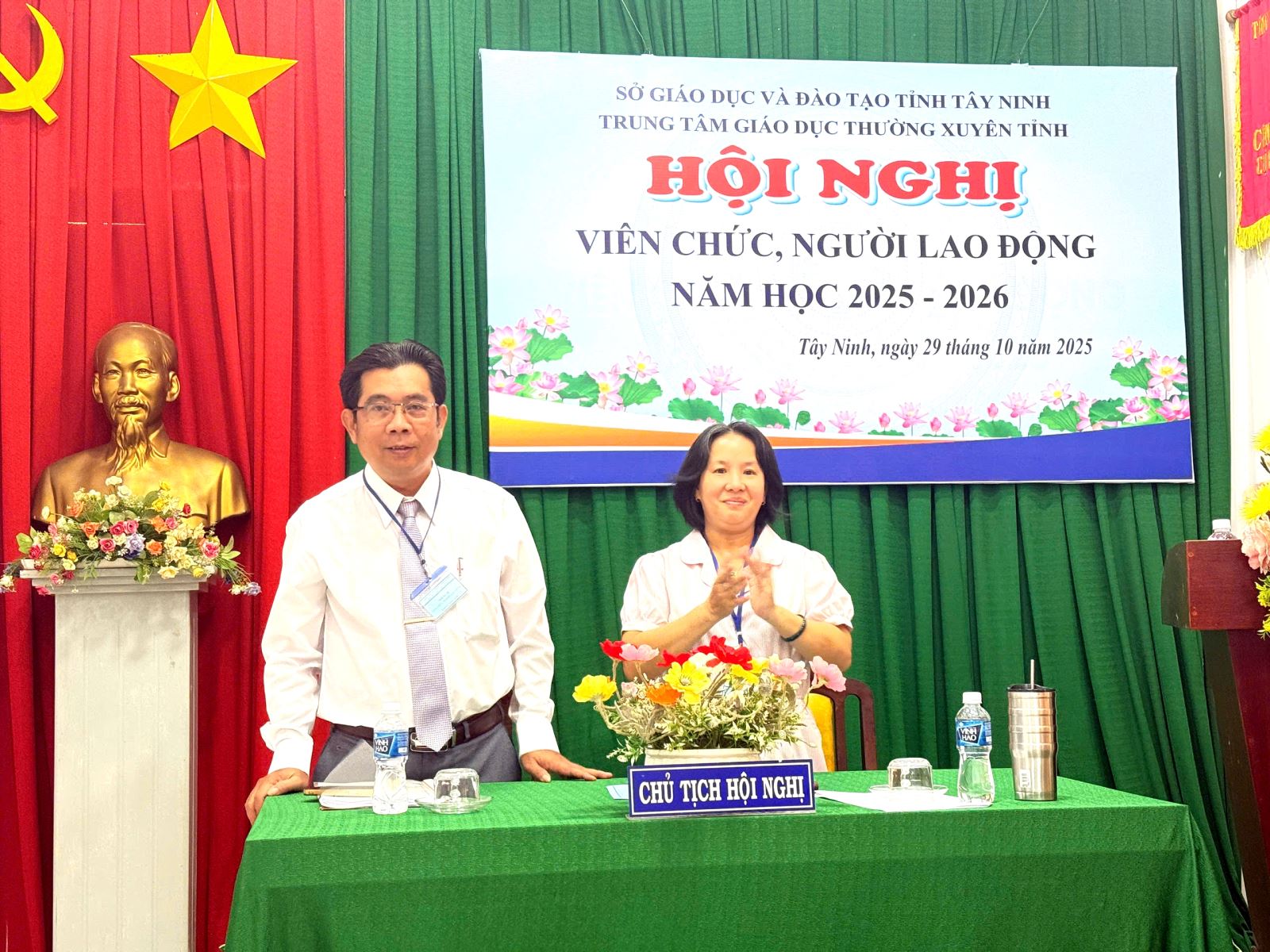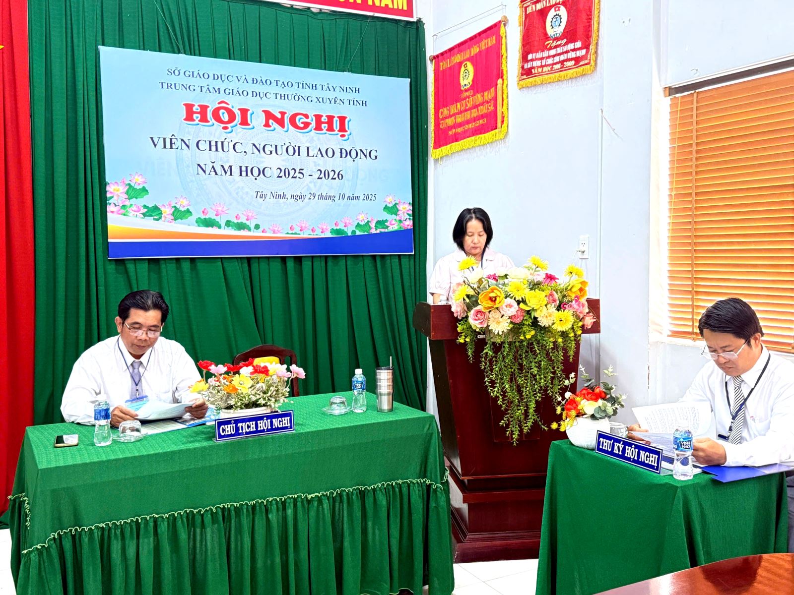 Ngày 29/10/2025, Trung tâm GDTX tỉnh Tây Ninh tổ chức Hội nghị Viên chức, người lao động đơn vị năm học 2025-2026. Dự Hội nghị có 100% VCNLĐ của đơn vị.