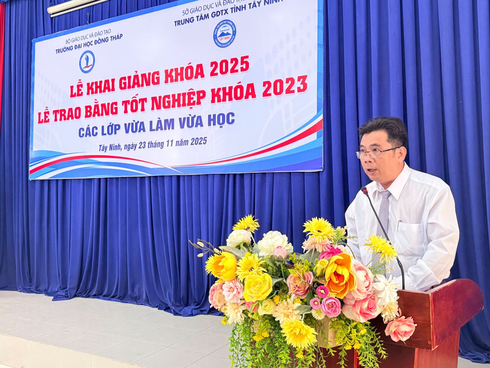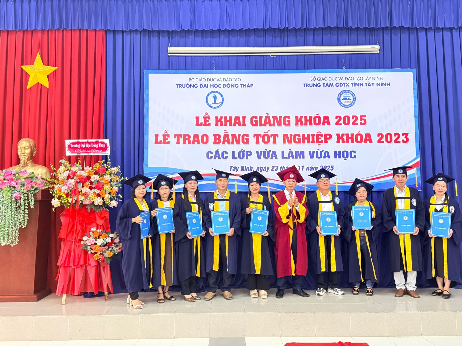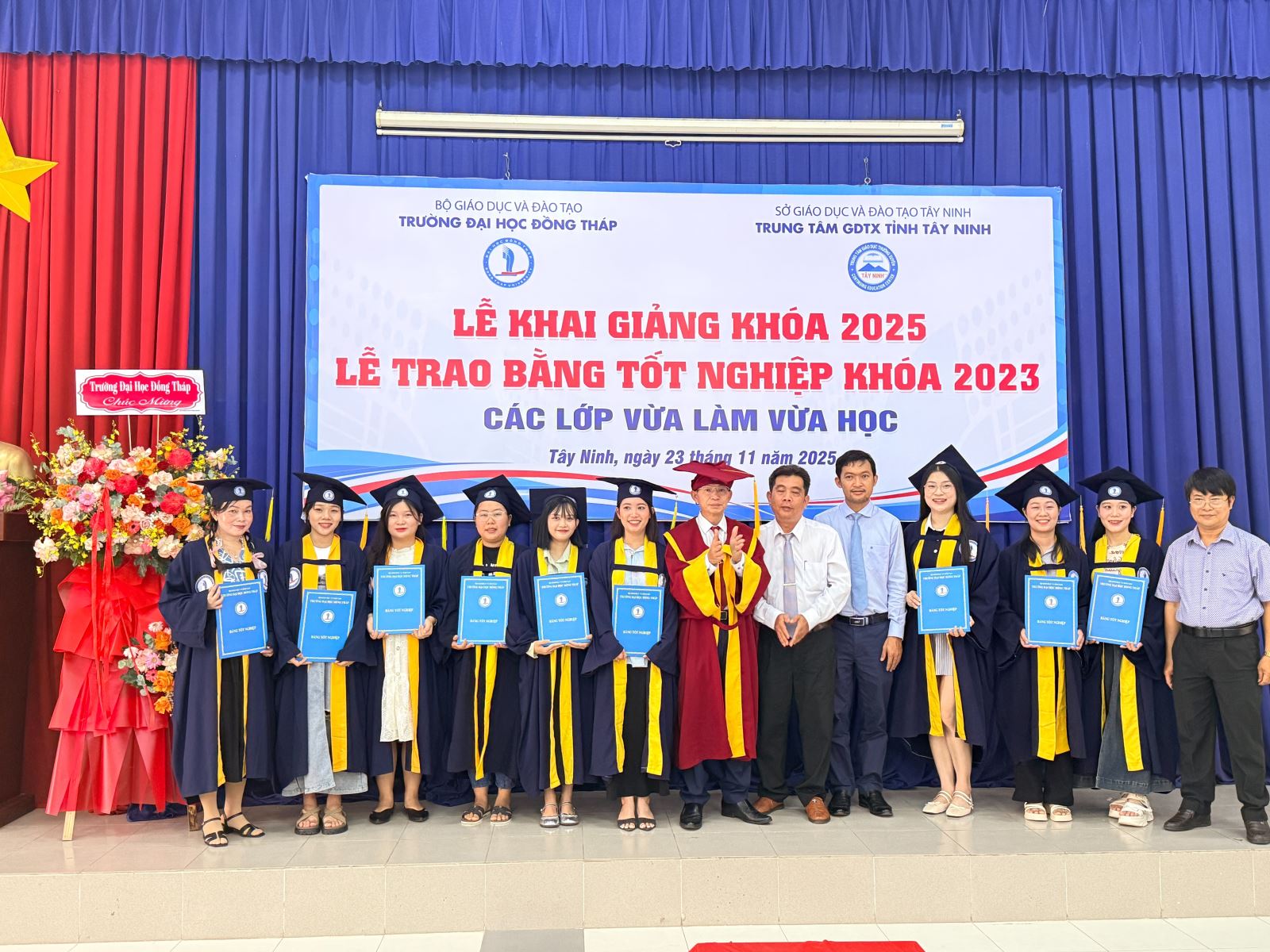 Sáng ngày 23/11/2025, Trung tâm Giáo dục thường xuyên tỉnh Tây Ninh phối hợp với Trường Đại học Đồng Tháp long trọng tổ chức Lễ Bế giảng các lớp đào tạo VLVH năm 2023 và Lễ Khai giảng các lớp đào tạo VLVH năm 2025. Đây là sự kiện quan trọng đánh dấu sự trưởng thành của các tân cử nhân, đồng thời mở ra hành trình học tập mới cho khóa sinh viên tiếp theo.