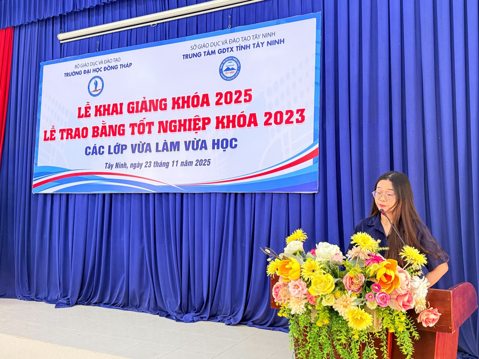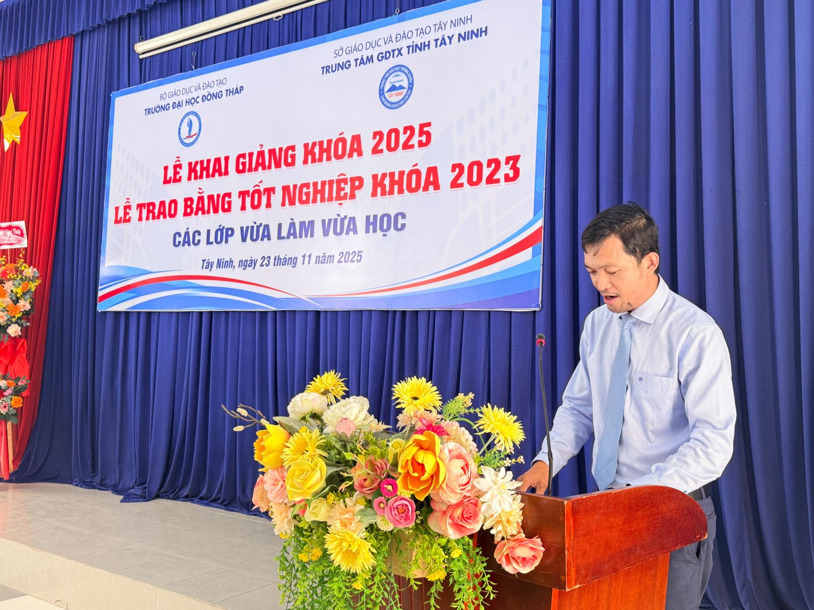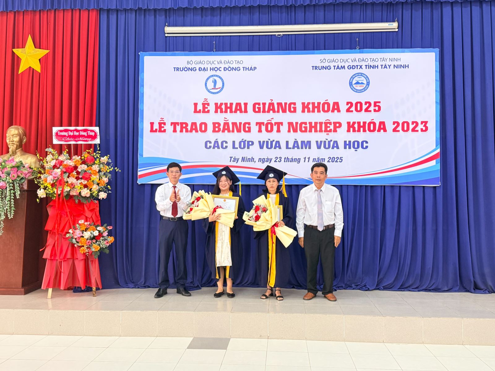 Sáng ngày 23/11/2025, Trung tâm Giáo dục thường xuyên tỉnh Tây Ninh phối hợp với Trường Đại học Đồng Tháp long trọng tổ chức Lễ Bế giảng các lớp đào tạo VLVH năm 2023 và Lễ Khai giảng các lớp đào tạo VLVH năm 2025. Đây là sự kiện quan trọng đánh dấu sự trưởng thành của các tân cử nhân, đồng thời mở ra hành trình học tập mới cho khóa sinh viên tiếp theo.