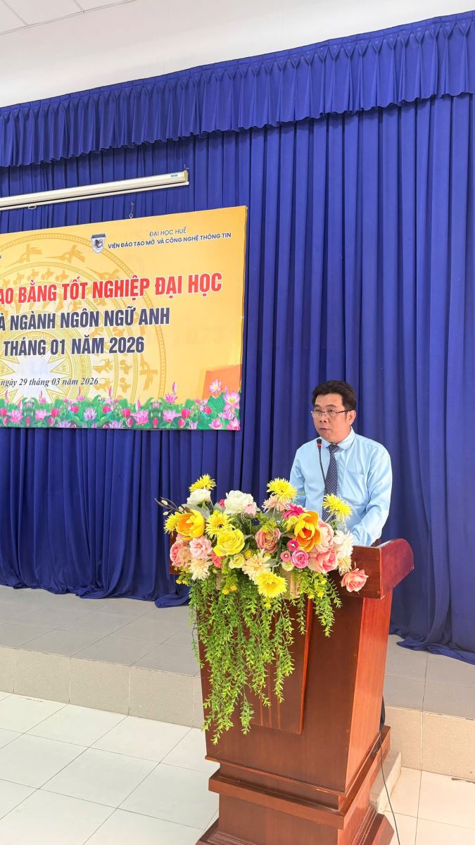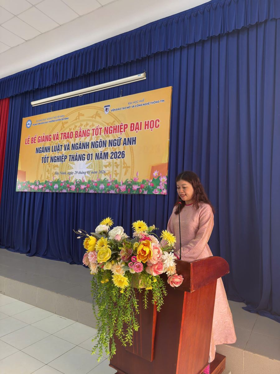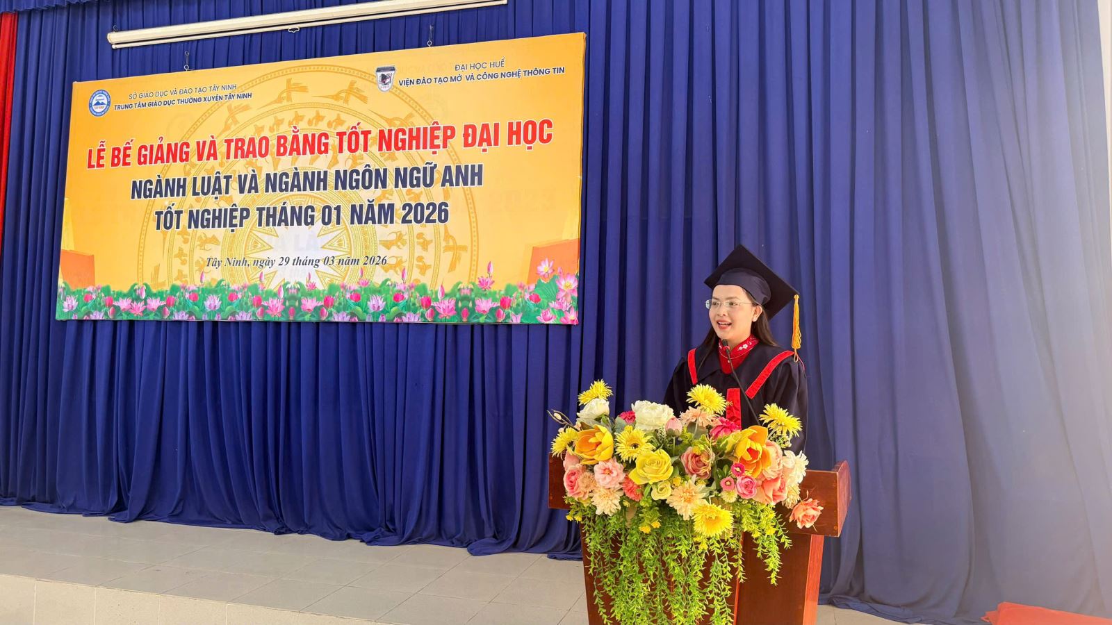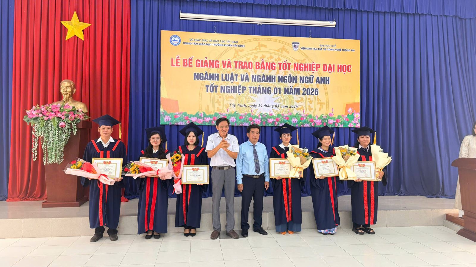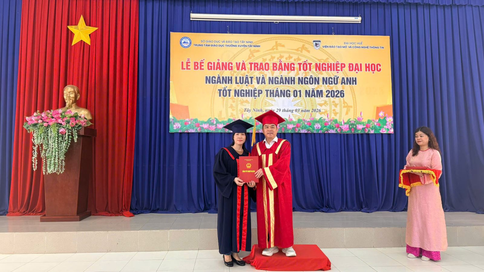 Sáng ngày 29/3/2026, tại Trung tâm GDTX tỉnh Tây Ninh, Viện Đào tạo mở và Công nghệ thông tin - Đại học Huế phối hợp với Trung tâm Giáo dục thường xuyên tỉnh Tây Ninh long trọng tổ chức Lễ bế giảng và trao bằng tốt nghiệp đại học khóa tốt nghiệp tháng 01/2026 cho 65 sinh viên các ngành Luật và Ngôn ngữ Anh.