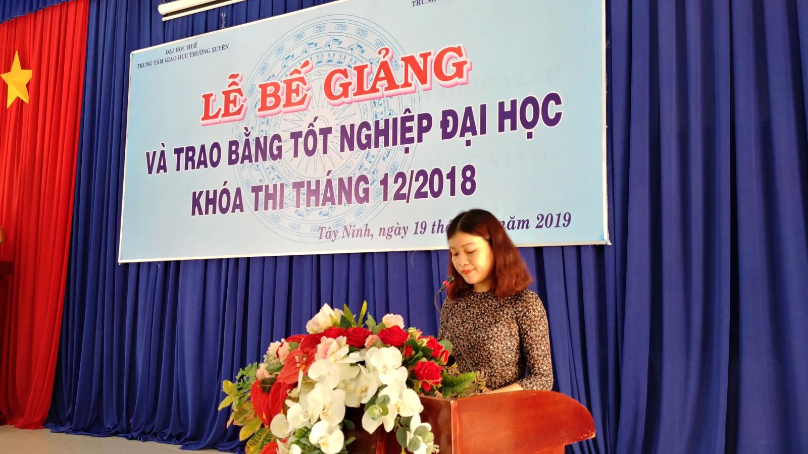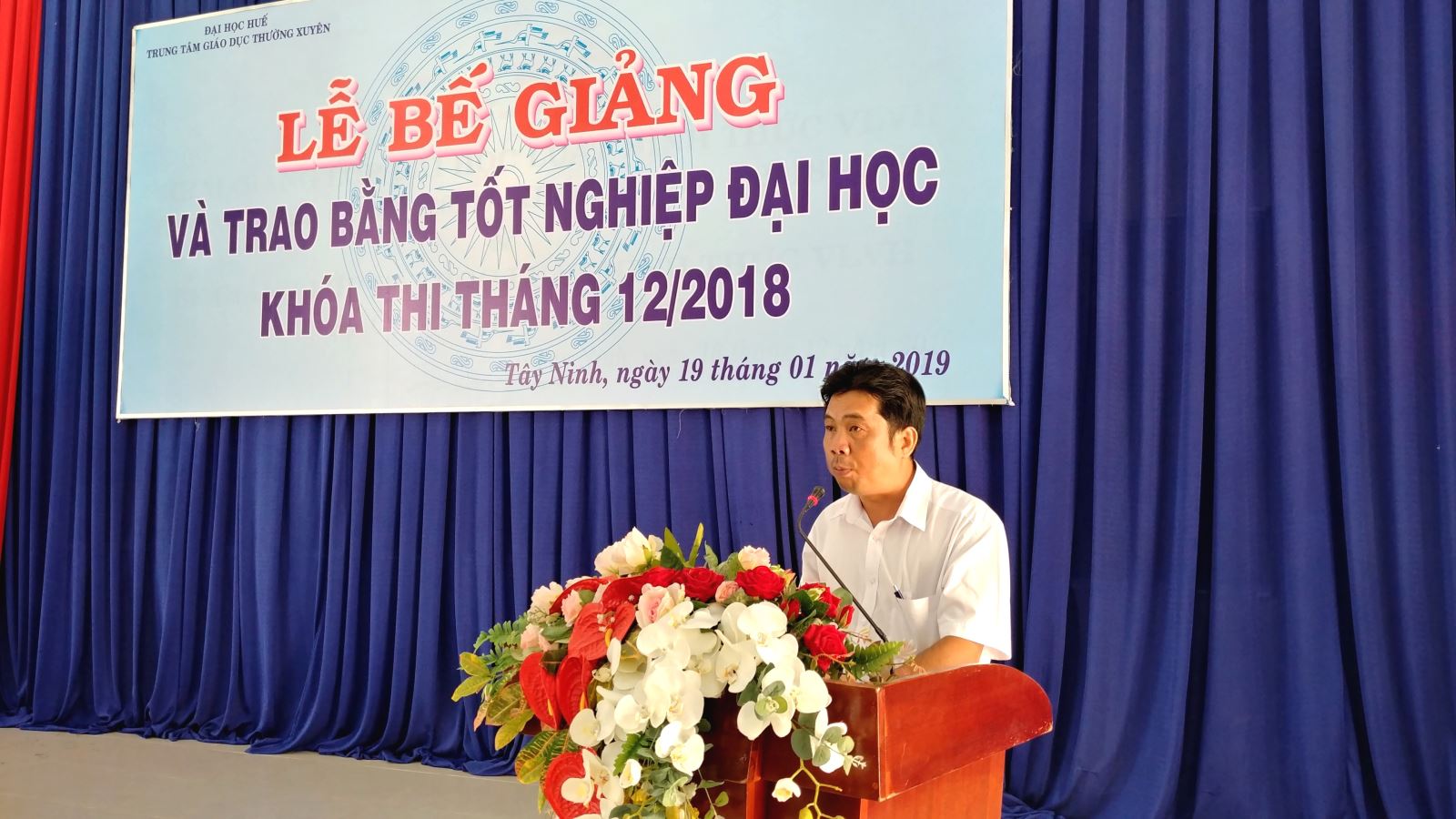Ngày 19/01/2019, Trung tâm Giáo dục thường xuyên Tây Ninh đã tổ chức lễ bế giảng và trao bằng tốt nghiệp lớp Đại học Luật hệ ĐTTX K10 vb2 liên kết đào tạo với Trung tâm GDTX Đại học Huế. Đến dự có đại diện Ban Lãnh đạo và Chuyên viên bộ phận đào tạo hai Trung tâm Giáo dục thường xuyên cùng 24 tân cử nhân được nhận bằng.