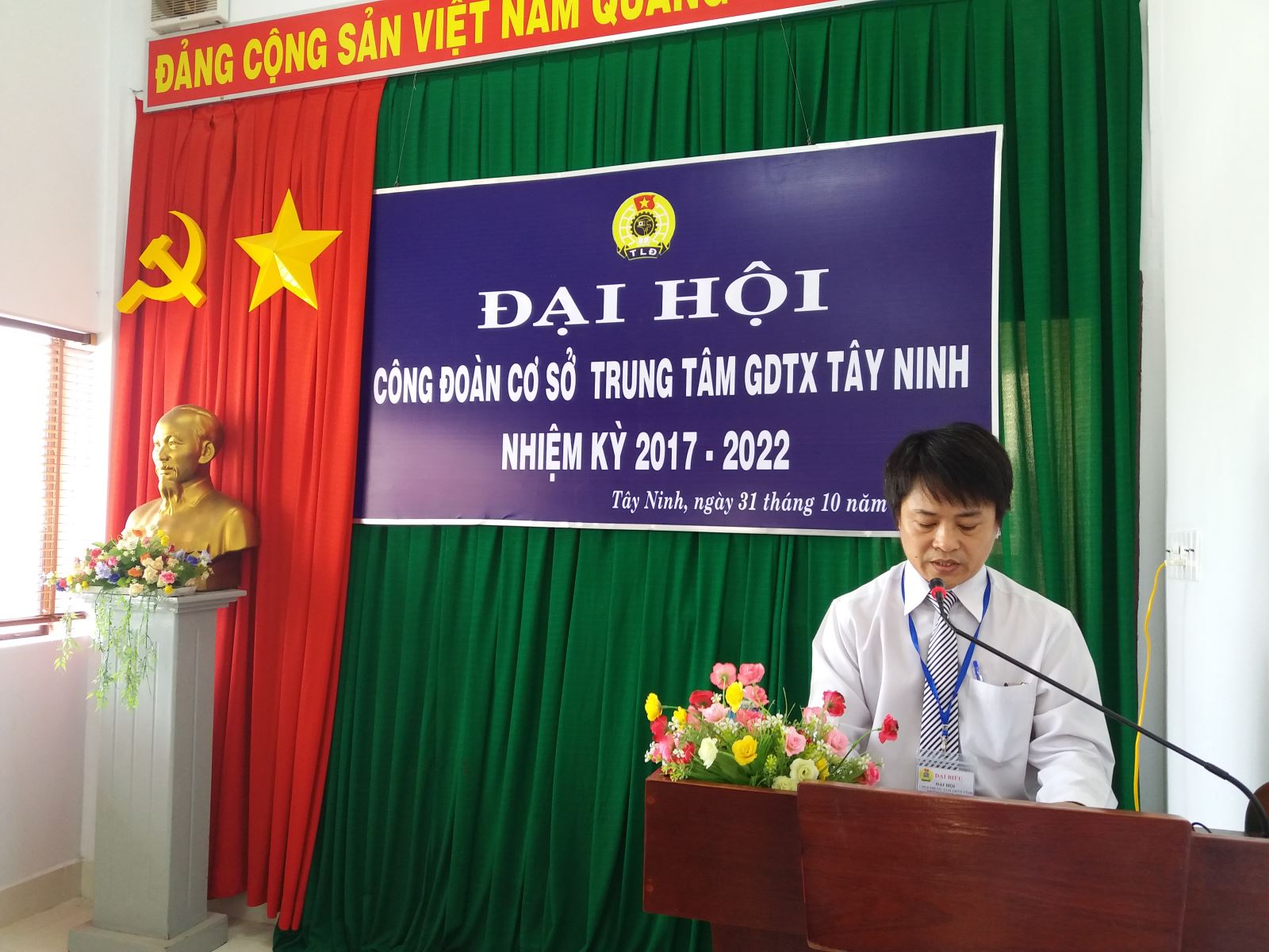 Chiều ngày 31/10/2017, Đoàn viên Công đoàn cơ sở Trung tâm Giáo dục thường xuyên tỉnh Tây Ninh đã tổ chức Đại hội Công đoàn cơ sở Trung tâm GDTX tỉnh Tây Ninh nhiệm kỳ 2017-2022. Đại hội nghị đã được chuẩn bị từng bước từ soạn thảo văn kiện, điều chỉnh số liệu, nghiên cứu quy định, đề ra kế hoạch hoạt động ... và tổ chức hội nghị ở các tổ, đề cử, ứng cử, dự kiến nhân sự Ban Chấp hành nhiệm kỳ 2017-2022, theo đúng hướng dẫn của Công đoàn ngành.