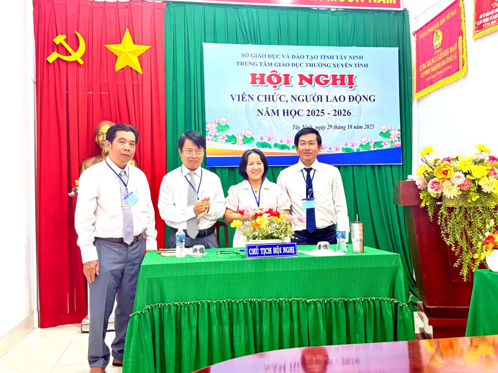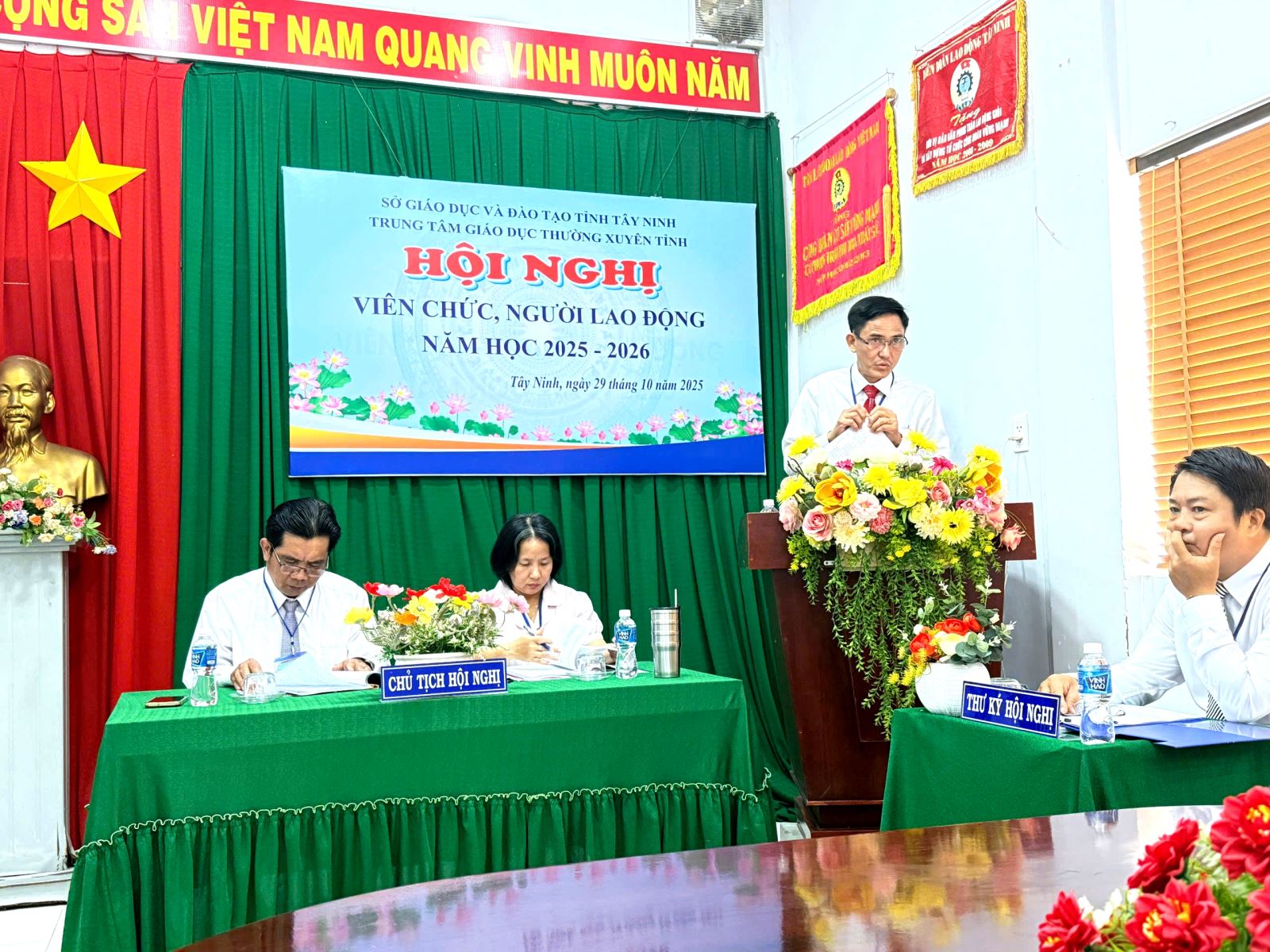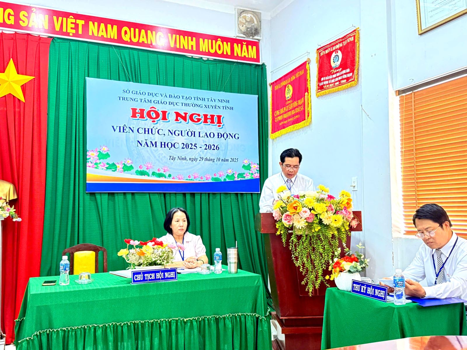 Ngày 29/10/2025, Trung tâm GDTX tỉnh Tây Ninh tổ chức Hội nghị Viên chức, người lao động đơn vị năm học 2025-2026. Dự Hội nghị có 100% VCNLĐ của đơn vị.