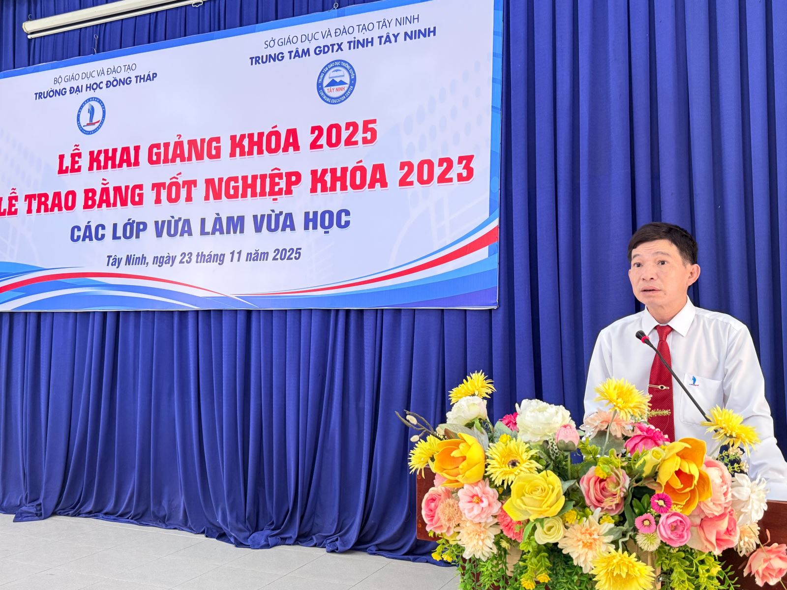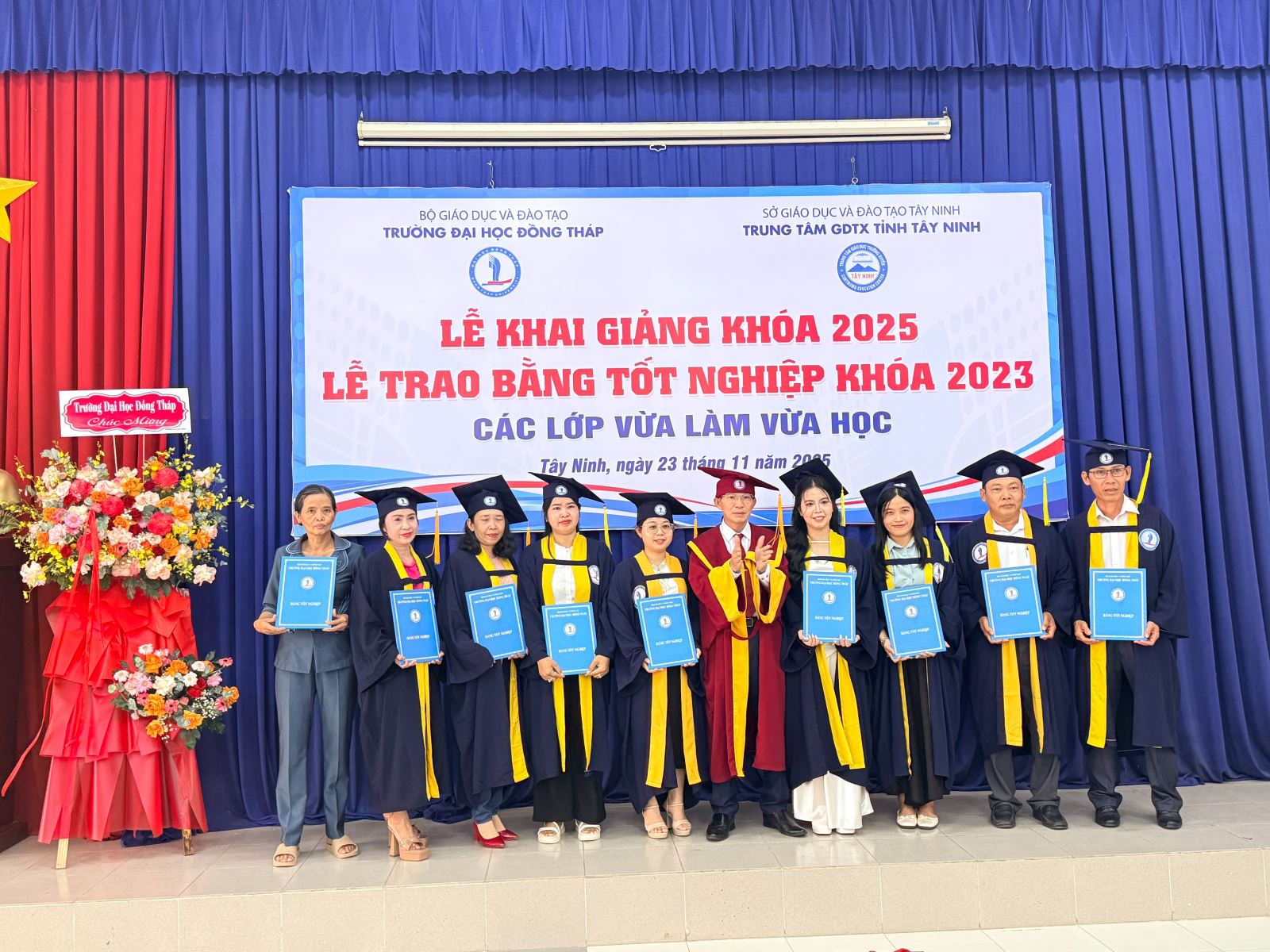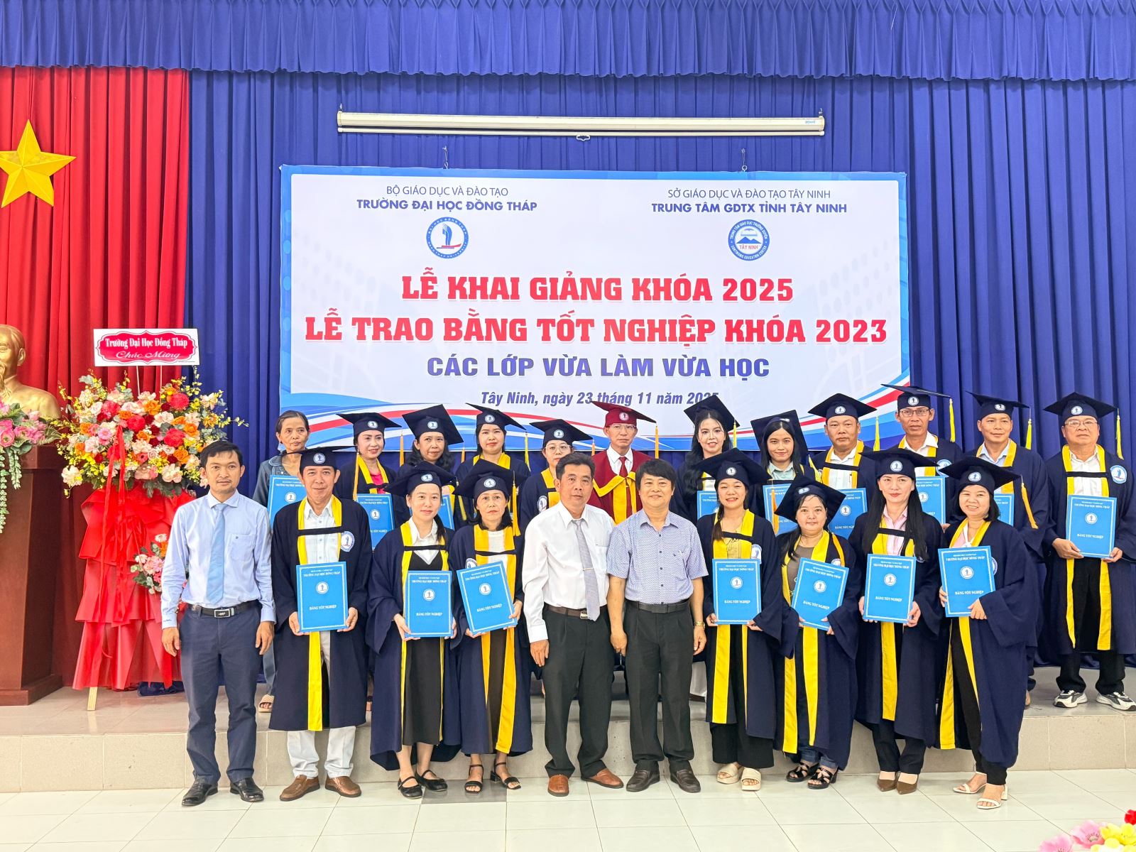 Sáng ngày 23/11/2025, Trung tâm Giáo dục thường xuyên tỉnh Tây Ninh phối hợp với Trường Đại học Đồng Tháp long trọng tổ chức Lễ Bế giảng các lớp đào tạo VLVH năm 2023 và Lễ Khai giảng các lớp đào tạo VLVH năm 2025. Đây là sự kiện quan trọng đánh dấu sự trưởng thành của các tân cử nhân, đồng thời mở ra hành trình học tập mới cho khóa sinh viên tiếp theo.