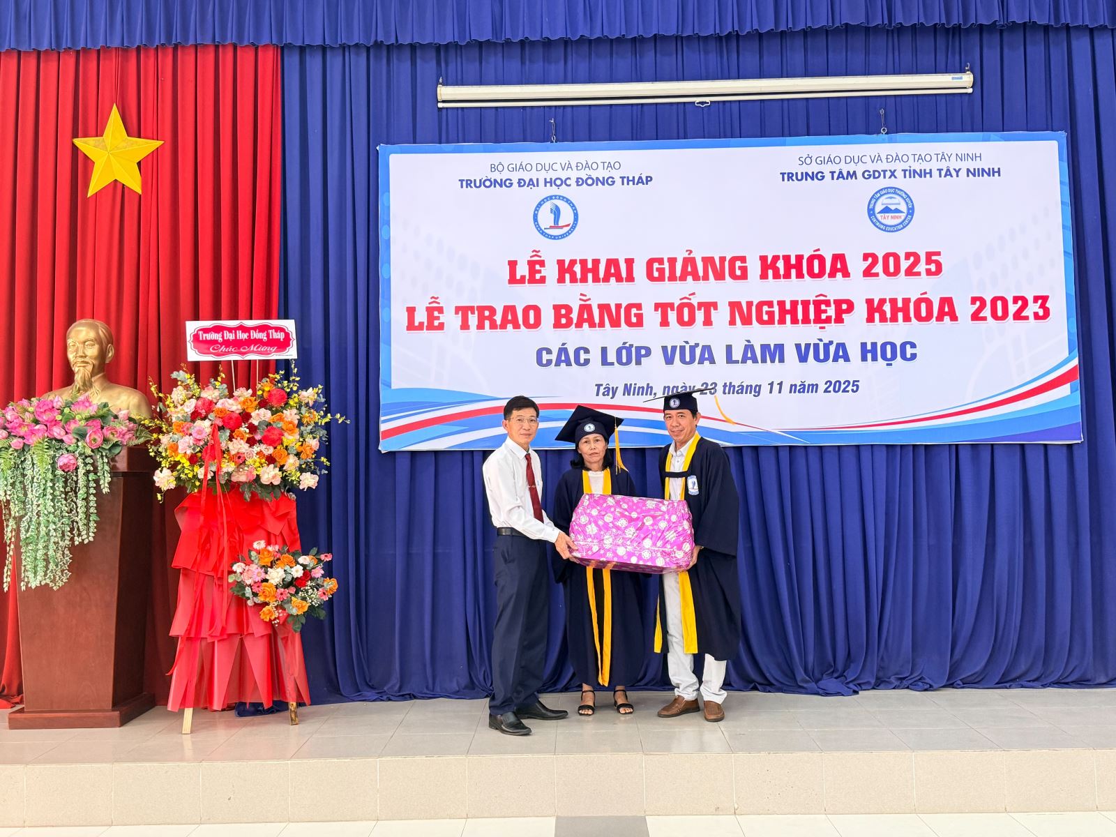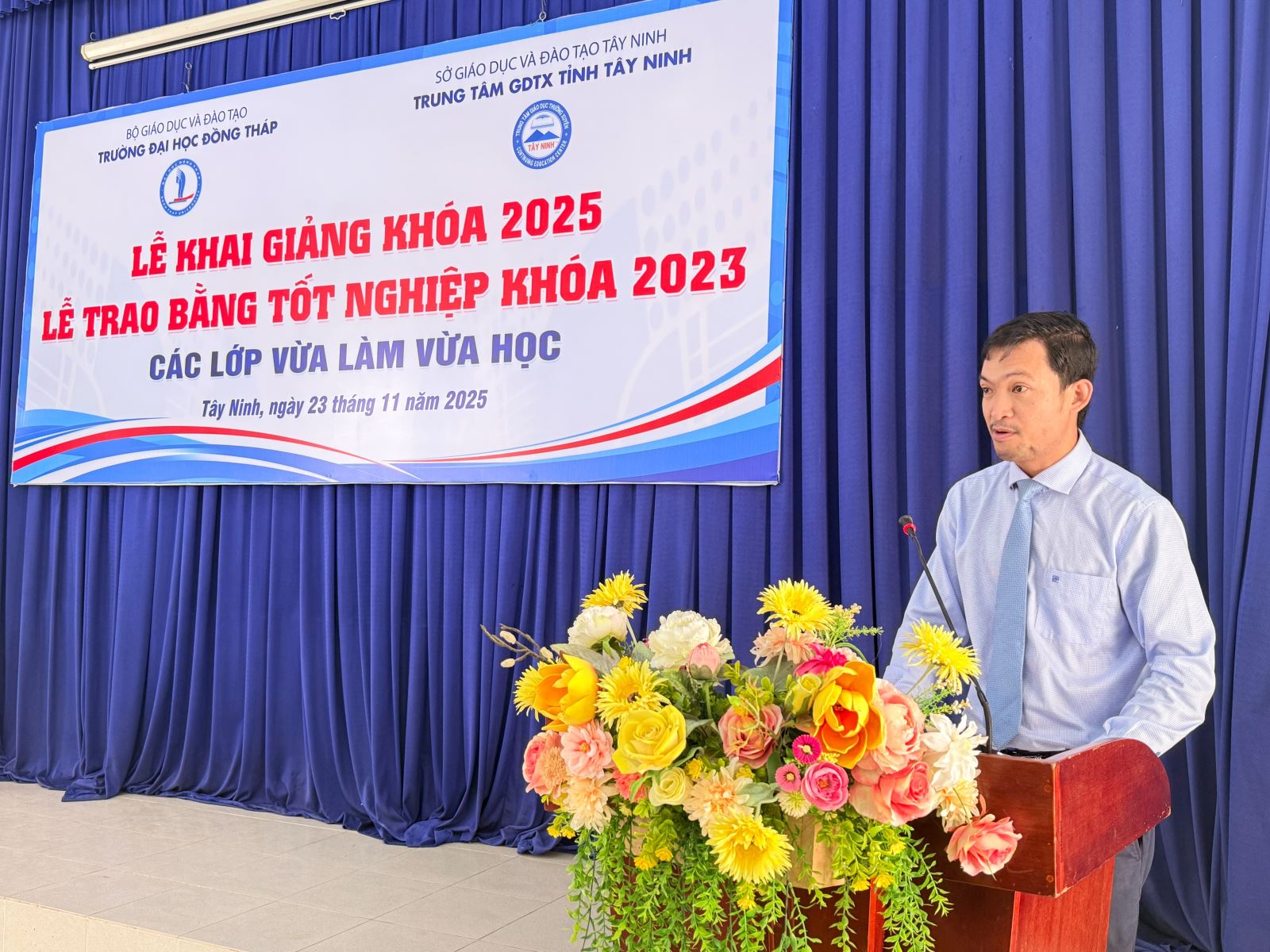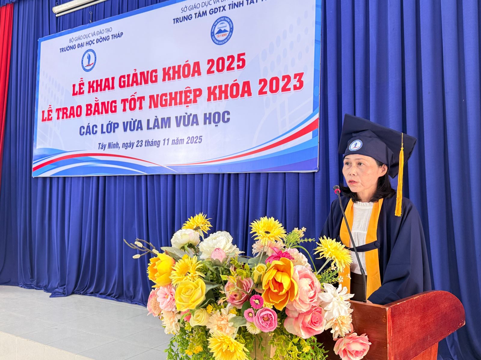 Sáng ngày 23/11/2025, Trung tâm Giáo dục thường xuyên tỉnh Tây Ninh phối hợp với Trường Đại học Đồng Tháp long trọng tổ chức Lễ Bế giảng các lớp đào tạo VLVH năm 2023 và Lễ Khai giảng các lớp đào tạo VLVH năm 2025. Đây là sự kiện quan trọng đánh dấu sự trưởng thành của các tân cử nhân, đồng thời mở ra hành trình học tập mới cho khóa sinh viên tiếp theo.